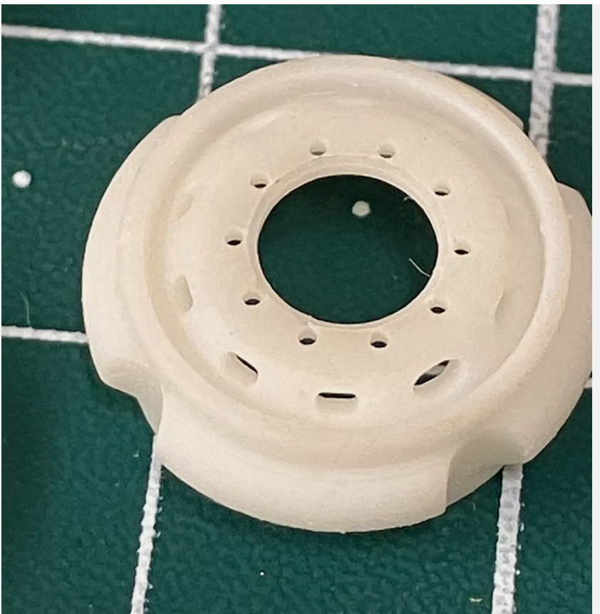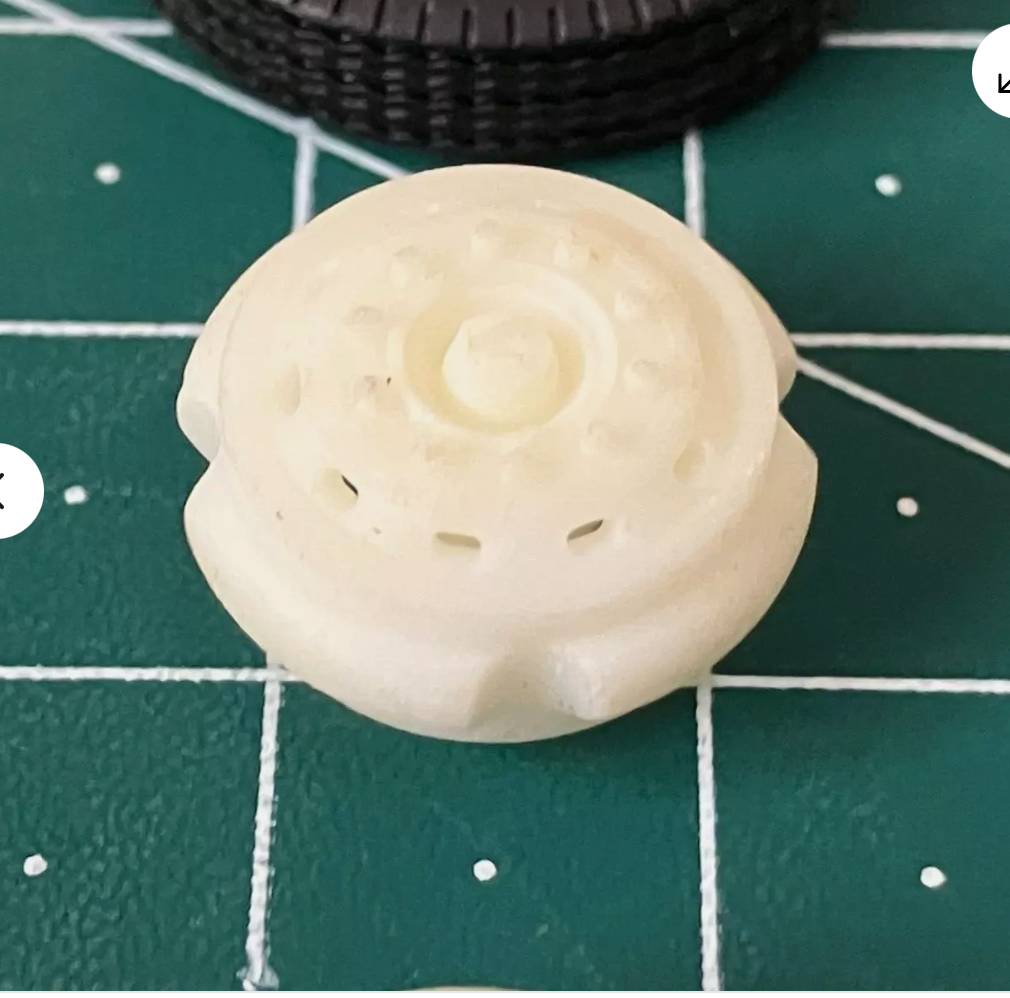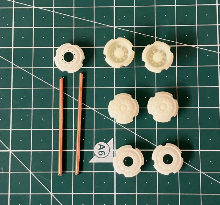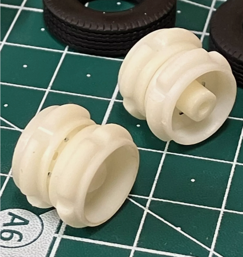 3D printed wheel set to suit the Volvo F86 kit, includes 1 pair of front wheels, one set or rear dual wheels, one spare wheel and 2x 2mm mild steel axle rods.